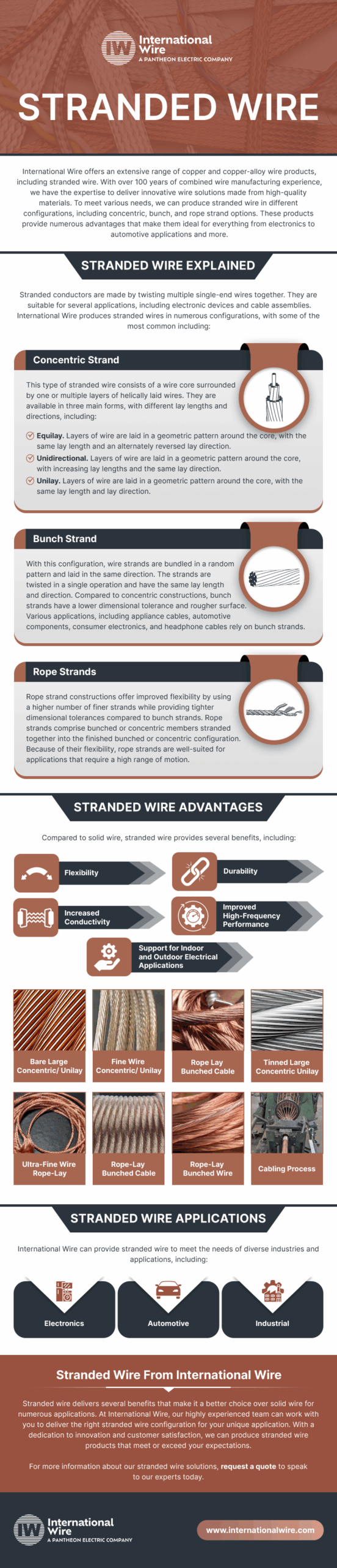 International Wire offers an extensive range of copper and copper-alloy wire products, including stranded wire. With over 100 years of combined wire manufacturing experience, we have the expertise to deliver innovative wire solutions made from high-quality materials. To meet various needs, we can produce stranded wire in different configurations, including concentric, bunch, and rope strand options. These products provide numerous advantages that make them ideal for everything from electronics to automotive applications and more.